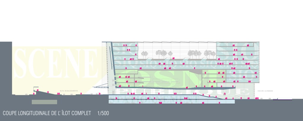 The public is invited to move into the block through this coupe du soleil. As a public conduit, it allows for internal linkages between programmatic components as well as urban spaces beyond. To the south, la coupe links la Place des Festivals while also opening to a future green space and transportation hub within the northern coller and Place des Arts.