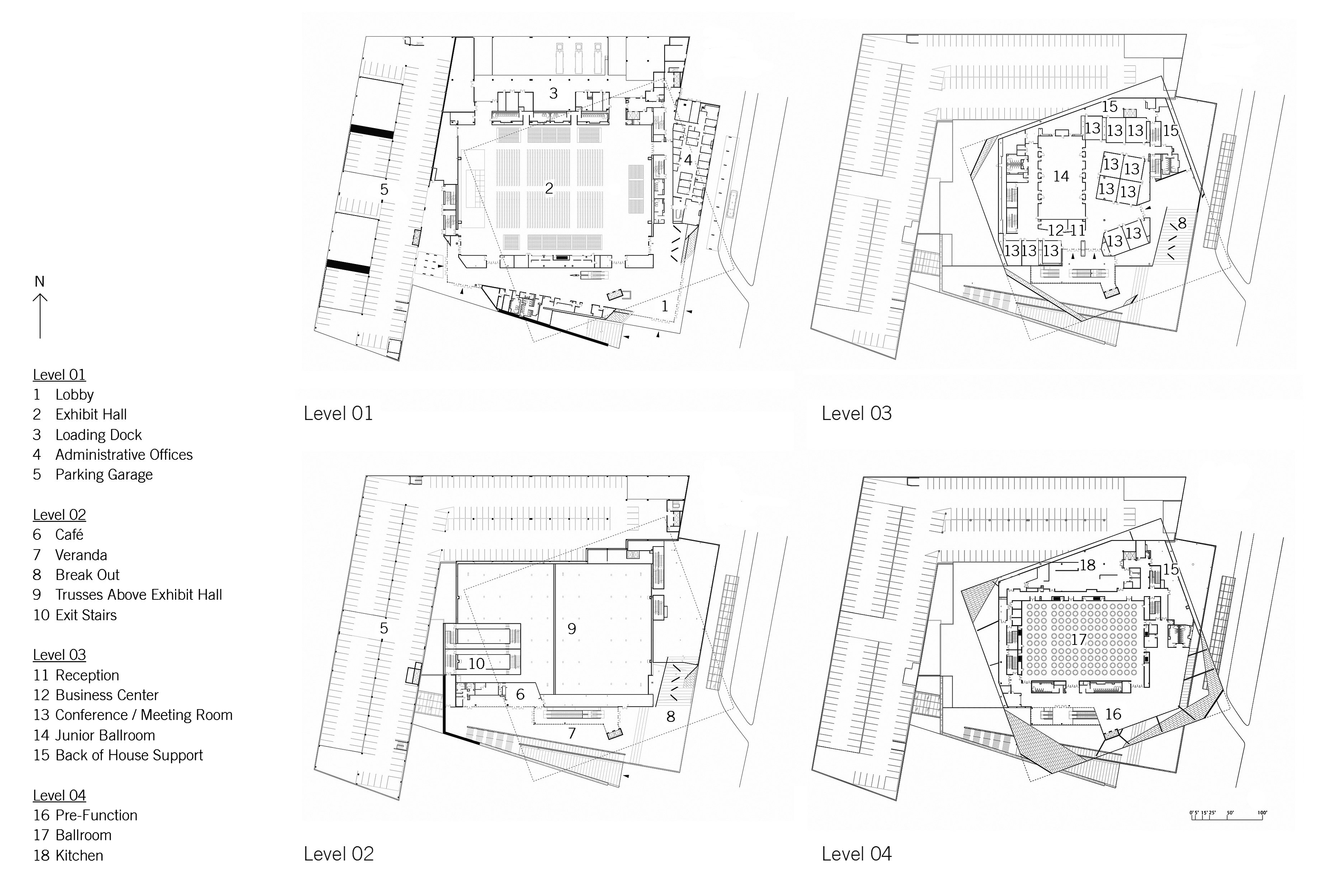 The first floor is organized around the 50,000 square foot column-free Exhibit Hall. This space is supported by adjacent lobbies, administrative offices, structured parking, and loading docks. Above the Exhibit Hall are 20,000 square feet of meeting rooms, including a 7,000 square foot Junior Ballroom. On the uppermost level is the 20,000 square foot Grand Ballroom and the facilities kitchen. Wrapping up and around the exteriors of these volumes are a series of ramps, stairs, and terraces, providing shaded break out spaces, meeting areas, and cafe dining.