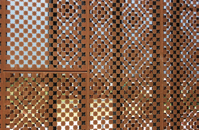 The building’s distinctive copper skin uses variably sized and shaped perforations to transition from opaque to clear. The perforations provide a sense of movement and help to mediate the scale of the facades. Inspired by M.C. Escher’s Sky and Water I (1938), the Irving Convention Center perforation pattern reduces the visual and physical weight of the building skin while maintaining consistency throughout the form. It gradates from 50% to 100% opaque in thirty feet, and is adjusted locally to accommodate various visual and performative requirements around the building.