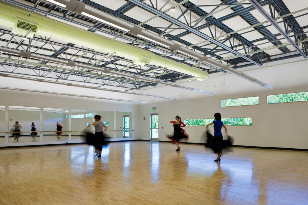 The two-story gymnasium includes a court area for compe-tition basketball or volleyball with bleacher seating for 300. It can also be reconfigured for parallel practice games of basketball, volleyball, and badminton. This ground-faced masonry block volume is articulated by a polycarbonate clerestory band on the north wall to allow for natural day lighting with minimal glare. Interior walls are clear-finished oriented strand board panels.