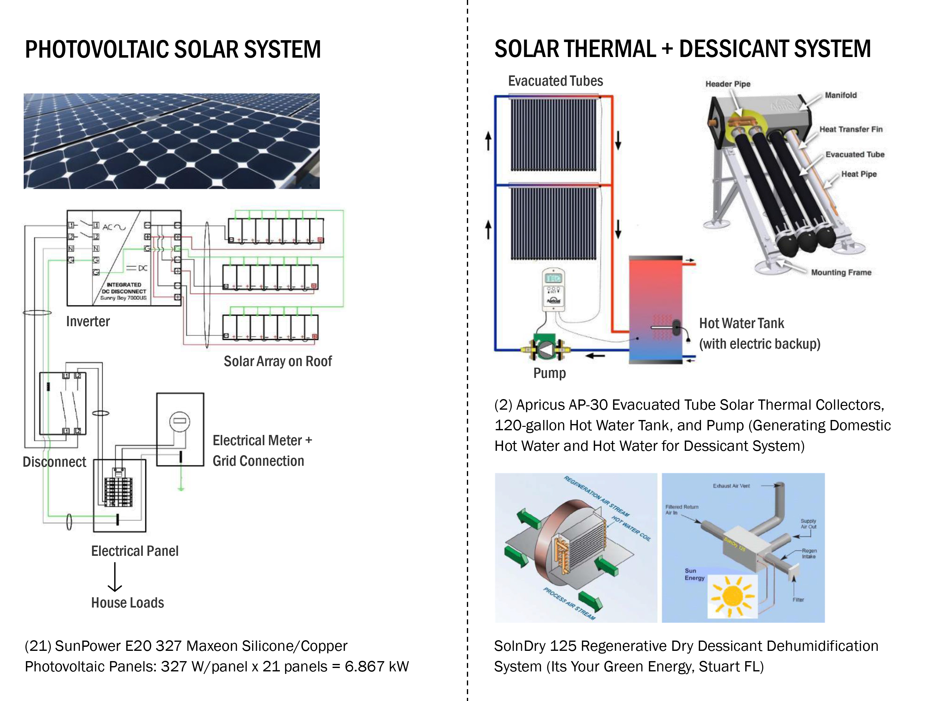 The most significant technological innovation in the Solar Living House is the solar thermal dehumidification system. This system generates hot water through two rooftop-mounted evacuated tube solar thermal collectors. The hot water is used to continually dry a regenerative solid desiccant material, typically white silica gel. The solid desiccant is used to adsorb moisture and humidity from the air without additional mechanical cooling. This strategy allows humidity to be modulated independently of air temperature, providing greater thermal comfort and reducing the opportunity for the growth of mold spores within the house while also reducing the overall energy consumption of the HVAC system.