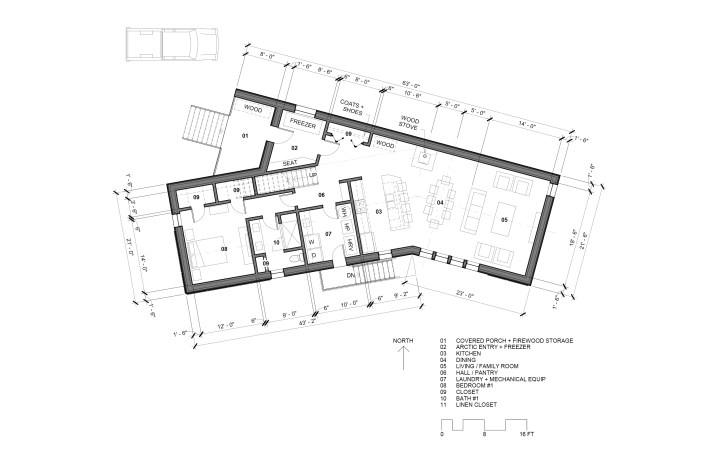 After discussion with the Council, the desire for large, flexible communal spaces was considered a priority. In addition, we have provided a separation of public and private spaces across the two story floor plan. The home has two arctic entry points, one for public use and one for private use that contains storage and space for utilities.