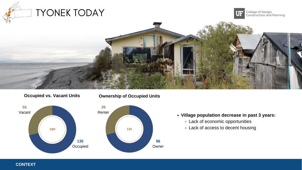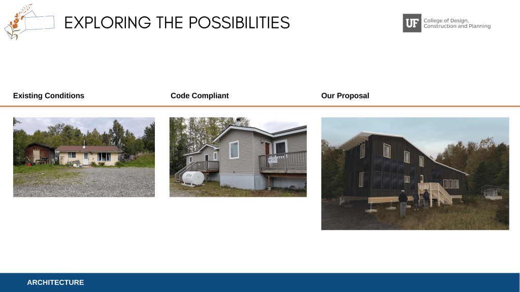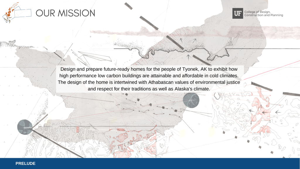 The Tebughna Fireweed Team from the University of Florida presents a sustainable new housing design for the Native Village of Tyonek in Tyonek, Alaska. Located just north of the Kenai Peninsula, 40 miles from Anchorage, and accessible only by plane or boat, Tyonek is a subsistence community with a housing crisis. Existing housing in the village is old and in disrepair, and lacks adequate infrastructure to provide reliable electrical utility service through the long winter months. The thermal envelopes of these houses are inefficient, leading to exorbitant heating costs and suboptimal thermal comfort. Celebrating the tribe’s rich history and their intimate understanding of the region’s ecosystems, this new housing aims to restore the people’s autonomy and independence by creating homes that are powered by the sun. Designed to meet aggressive performance targets, the houses are also designed to weather and age gracefully over time in this arctic environment, with “right to repair” central to our design ethos.