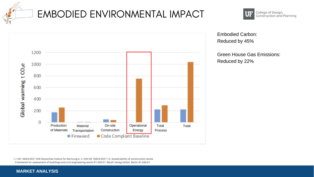 The Life Cycle Analysis (LCA) results show a reduction of embodied carbon of 45% compared to a code-compliant baseline. Materials, products, equipment, and services were sourced as locally as possible to minimize carbon emissions in transport. Transportation related carbon emissions were evaluated against the onsite benefits of the materials and systems.