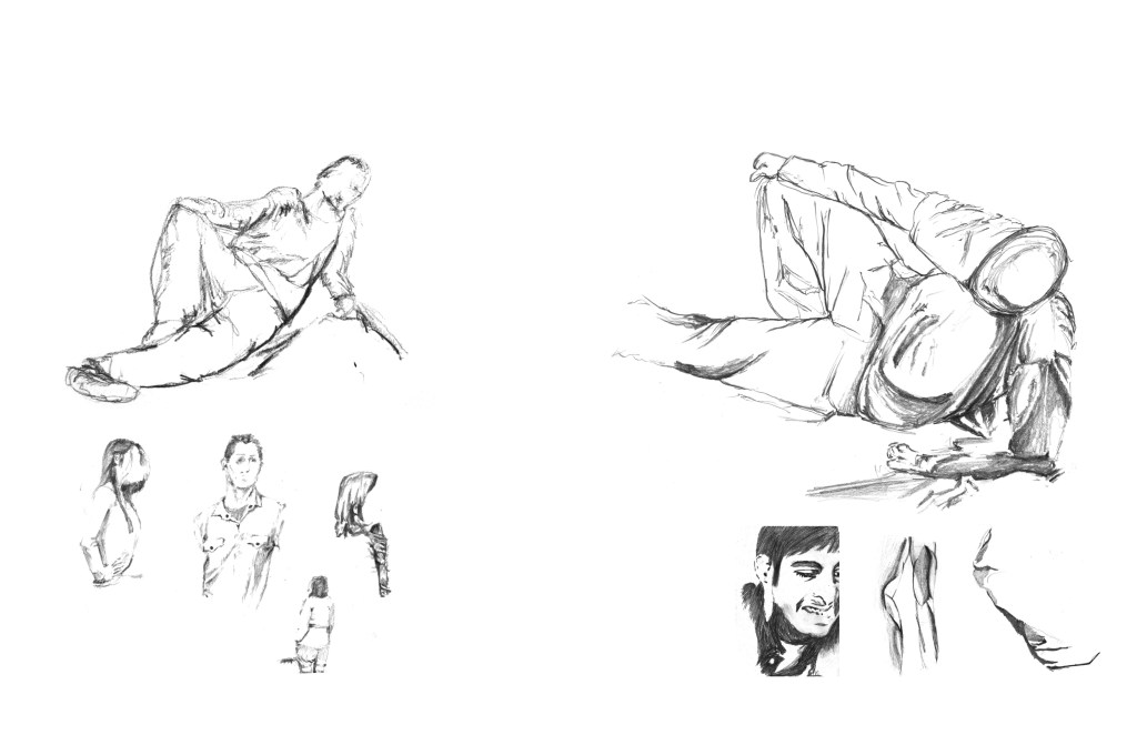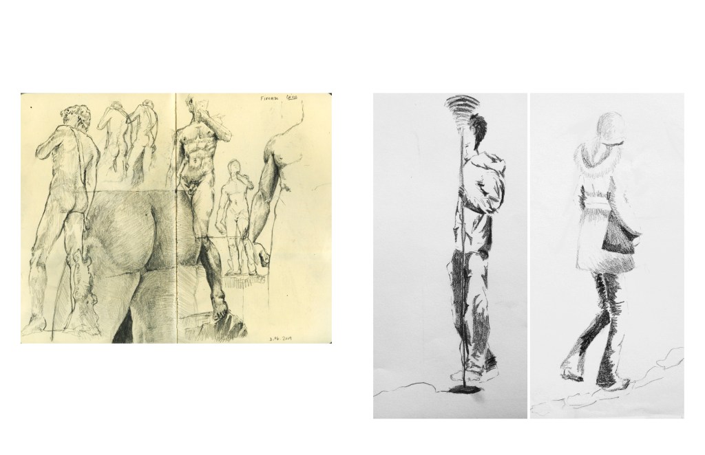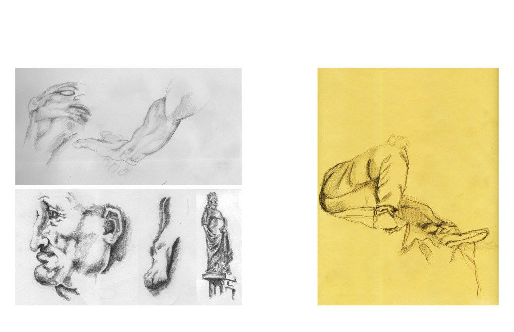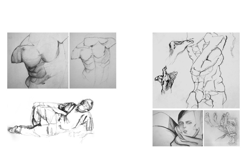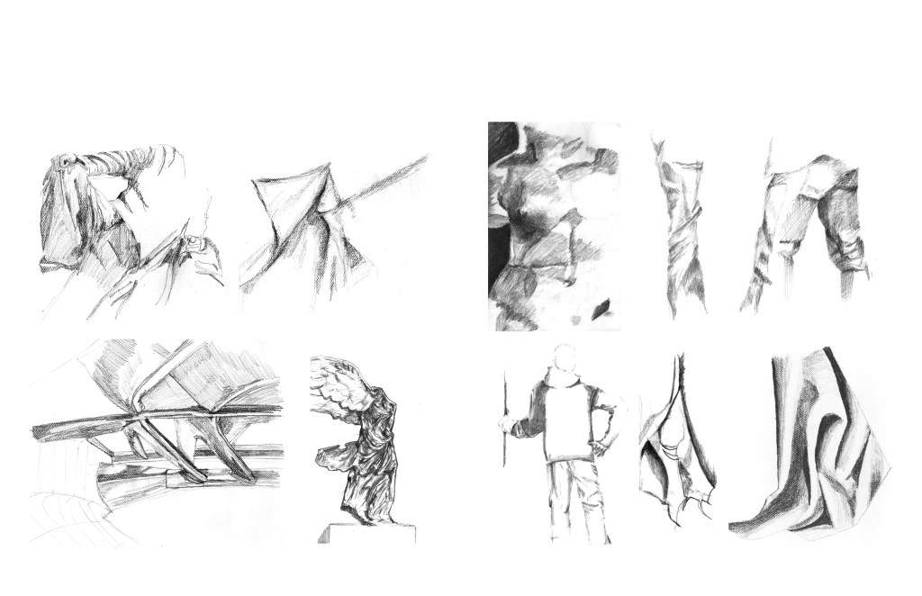 - Drawing Surface, Contour, Topographies, Texture: Representative drawing exercises: folded paper and fabric, figure studies (arms/legs crossed close to body), building facades, figural sculpture, horizon/cityscape, etc.